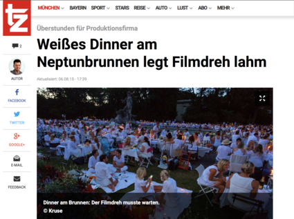 Eigentlich wollte die Firma Lüthje Schneider Hörl eine Szene für den Pilotfilm der Serie Urban Divas drehen. Doch als man am Mittwochabend gegen 20 Uhr am Neptunbrunnen das Set aufbauen wollte, staunten Schauspieler und Produzenten nicht schlecht. als die 600 in weiß gekleideten Menschen zum Abendessen auftauchten. „Wir wussten nicht, was wir machen sollten“, sagt Andreas Hörl zur tz. Mit so einem Hindernis war der erfahrene Produzent noch nie konfrontiert: „Ich bin seit 15 Jahren im Geschäft, aber so etwas habe ich noch nicht erlebt.“