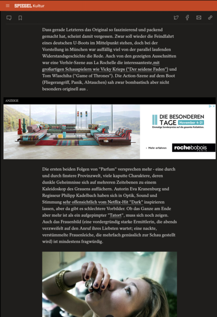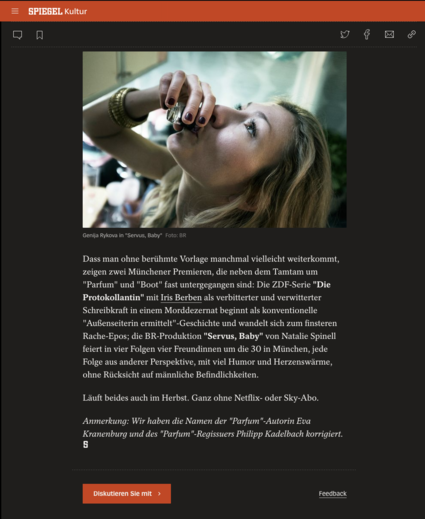 SPIEGEL: ''Der Humor ist krass, die Stimmung schwankt zwischen Absturz und Ekstase, zwischen Agonie und Erkenntnis. In ihren besseren Momenten erinnert die Serie an 'Girls', in ihren schlechteren an eine Art 'Sex and the City' aus dem Münchner Edelprekariat.'